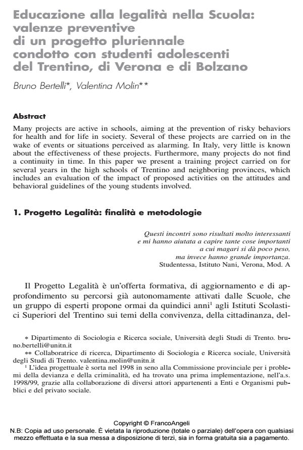Il libro è introdotto da una riflessione sulla cultura della legalità e sul senso civico quale binomio fondamentale per il buon funzionamento di una società e di una democrazia. Il senso civico ricomprende il rispetto della legalità ma non si esaurisce in quest’ultimo; va piuttosto inteso in un’accezione più esigente, che lo ricollega alla dimensione dell’ethos, delle norme e delle credenze morali, delle virtù e dei valori civici. È questo l’orientamento di fondo che illumina i due percorsi formativi denominati “progetto legalità” e “progetto legalità e cittadinanza attiva” in atto nelle Scuole del territorio trentino e di province limitrofe. Il libro fa il punto, con dati e riflessioni, intorno a un’esperienza che dura da oltre due decenni, e che, tra momenti di forte espansione e momenti di contrazione, ha contribuito a portare nelle Scuole “voci dall’esterno” che spesso si sono rivelate foriere di nuove spinte creative. Oggi i percorsi progettuali, all’interno dell’ambiente scolastico, intorno ai temi della legalità e della cittadinanza attiva, rispondono ad una esigenza, ormai avvertita a molti livelli, di rafforzare nelle giovani generazioni una relazionalità positiva e rispettosa dell’alterità e di orientarle verso mete di bene comune. Anche l’occasione offerta dai percorsi di Alternanza Scuola–Lavoro, può trovare, specie nelle Scuole a orientamento umanistico, linfa vitale da progetti come quelli presentati in questo volume.