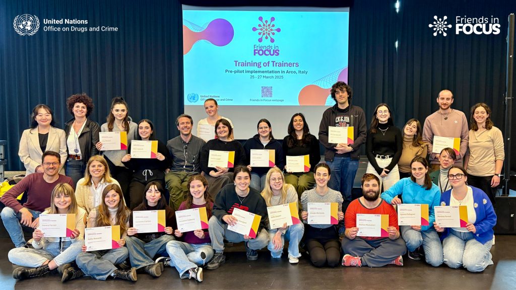 Progetto internazionale di peer education dedicato ai giovani. I Trainers sono giovani, formati da UNODC, fra i 19 ed i 25 anni che si rivolgono a ragazzi e ragazze fra i 14 ed i 17. Friends in Focus fornisce la capacità di riconoscere i fattori di rischio e i fattori protettivi nella propria vita e in quella dei propri coetanei. Permette ai ragazzi di agire in situazioni in cui si trovano sotto pressione. Invita i giovani a riflettere in maniera critica sulle informazioni che, per esempio i media, divulgano in merito all’uso delle droghe. Sfida i giovani ad analizzare le dinamiche sociali legate al consumo di sostanze e a riflettere su come poter contribuire positivamente
